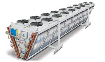 Los enfriadores de líquido y los condensadores se seleccionan habitualmente para las condiciones más extremas de carga térmica y con la máxima temperatura ambiental. Estas condiciones extremas pueden darse solamente por un corto intervalo de tiempo en el año, mientras que para el resto del año, con condiciones más normales, el equipo puede ser más pequeño. Por estas cuestiones, hemos proyectado un nuevo producto que puede seleccionarse para condiciones de uso normales, pero que también puede aumentar sus prestaciones cuando se extreman las condiciones de empleo. Este equipo se fabrica aplicando a los condensadores y enfriadores tradicionales, un sistema de pulverizado de agua en nebulosa dirigido al lado contrario al del flujo de aire que atraviesa el intercambiador. Con este sistema se puede enfriar el aire que atraviesa la batería, incrementando la potencia de los enfriadores y condensadores.